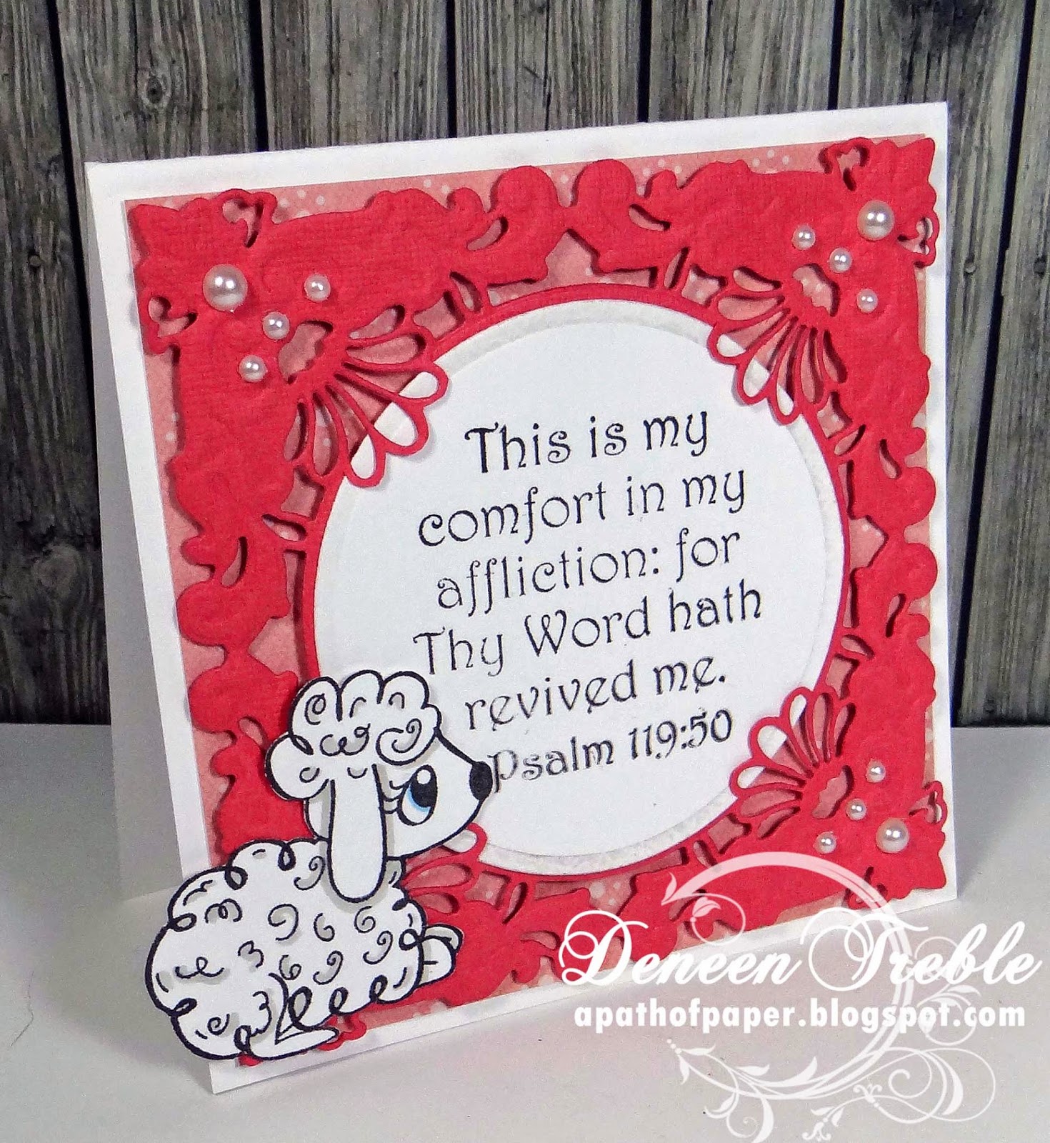Recipe: Inspired Stamps SS-Psalm 119:50, Sheep Laying, More Perfect Sentiments & His Little Ones: Shepherd, PP-Imaginisce For Peep's Sake Spring Fling, Bazzill CS-Flamingo, CTMH CS-White Daisy, Joy Crafts Frame Die 6002/1072, Spellbinders Standard Circles Lg., CTMH Ink-Black & Sorbet, Copics-W1, B02, Pearls, Foam Squares.