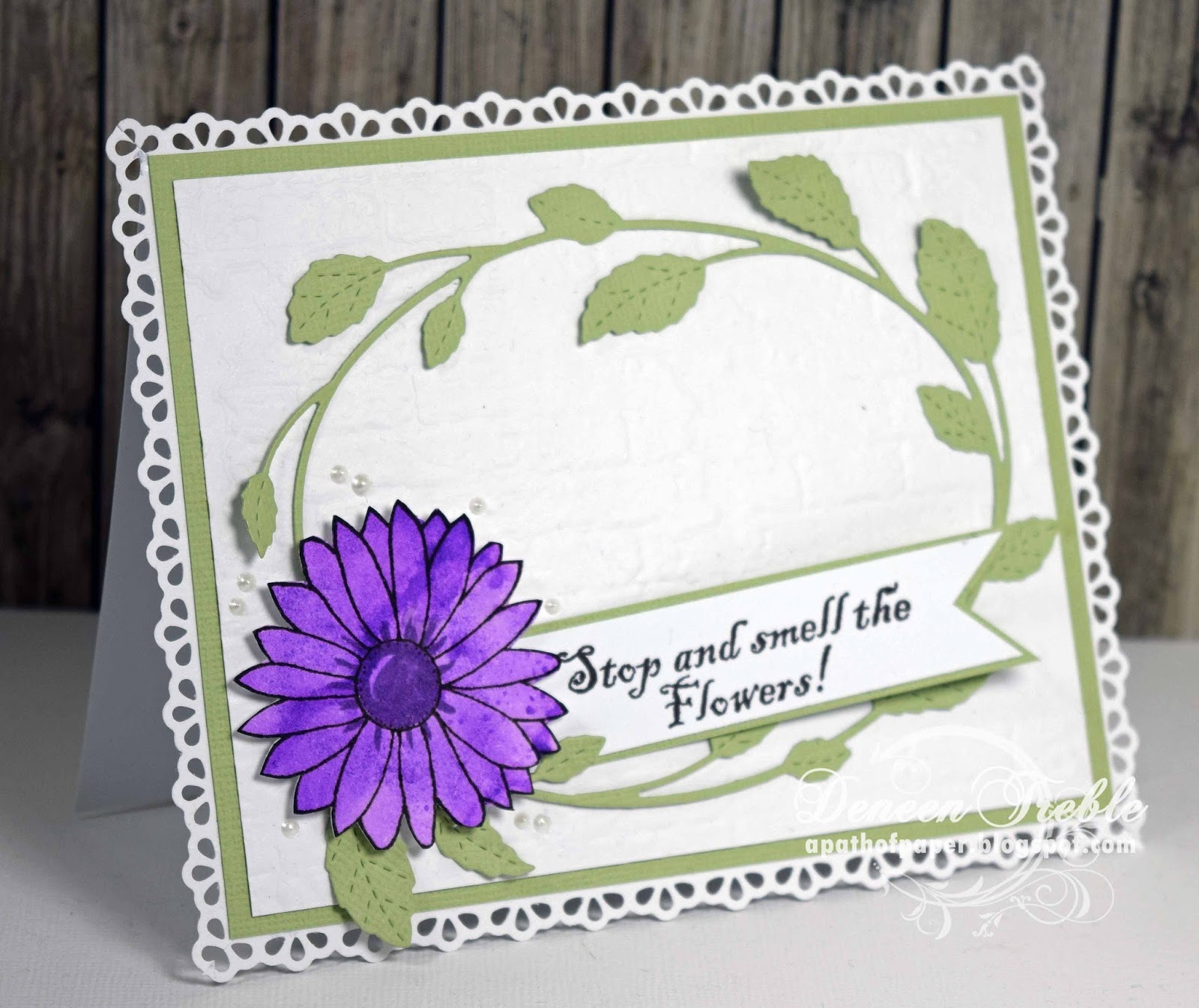 Recipe: Inspired Stamps SS-Flowers Value Pack & Perfect Sentiments, Bazzill CS-Mono Pear, CTMH CS-White Daisy, CTMH Ink-Black, Distress Inks-Wilted Violet, Poppystamps Hampstead Oval Frame, Martha Stewart Scroll Lace Border Punch, Foam Squares, Viva Decor Pearl Pen Ice.