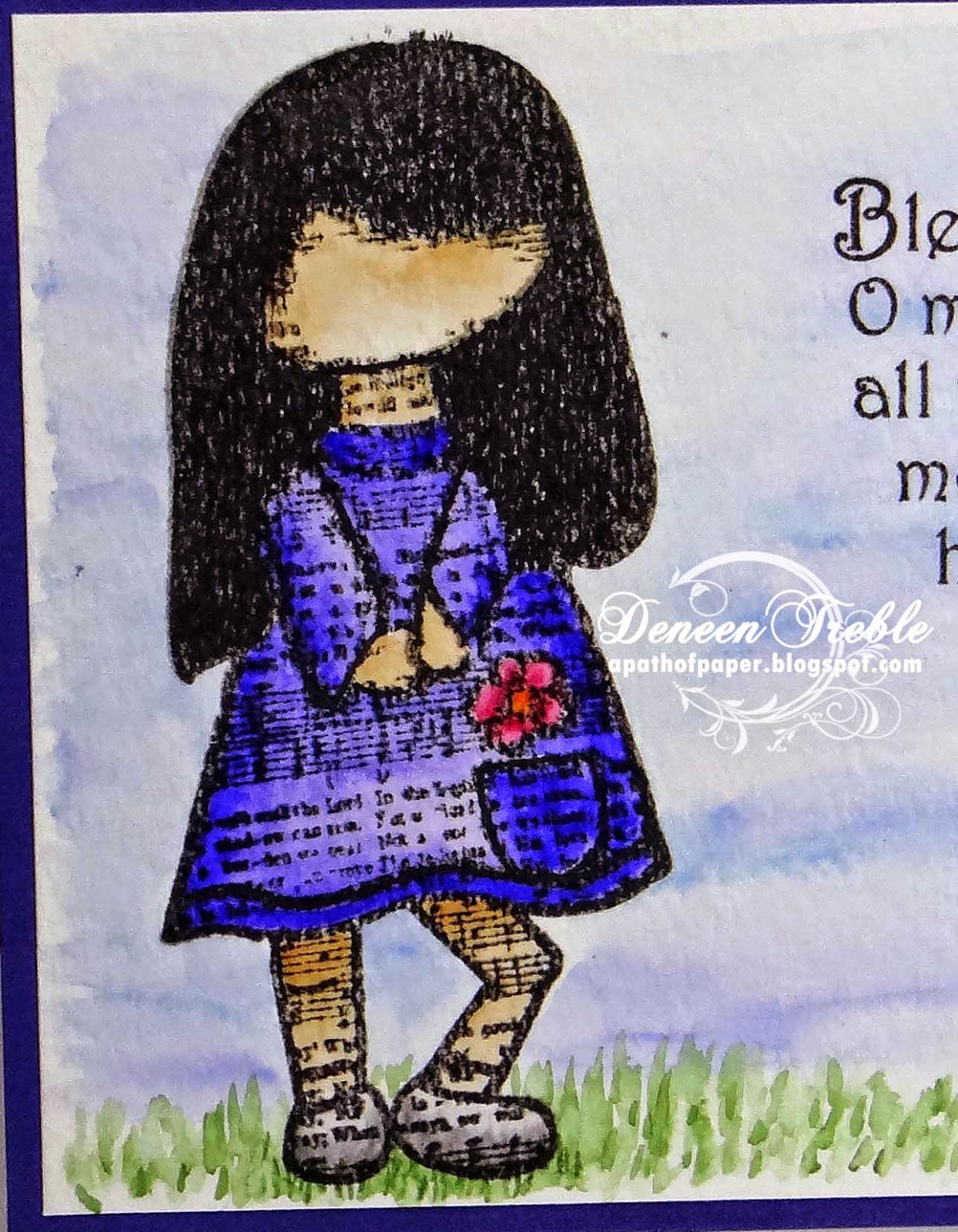 I stamped the flower onto watercolour paper using Tim Holtz Tumbled Glass Distress Ink. I then used Faded Jeans to colour in the petals. For the leaves I stamped them with Shabby Shutters and coloured them in using Peeled Paint.
